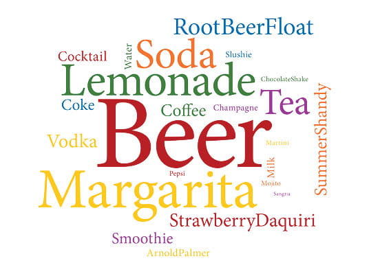 The top responses include mostly alcoholic beverages, but some others are listed as well. Top beverages include: beer, margarita and lemonade.