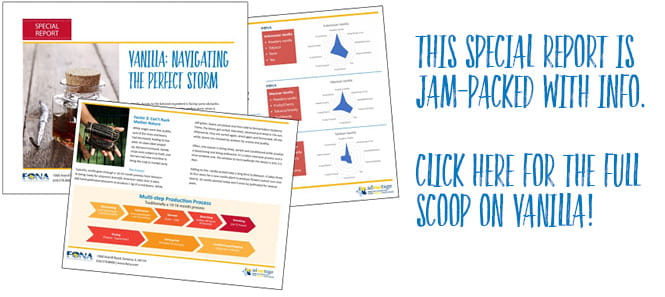 Bourbon is by far the most popular type of vanilla, balancing woody, powdery, tea and caramelized taste perceptions. As you can see in the charts located in our full report (linked below), other vanillas have different characteristics. But they may be options to explore if you can’t afford — or just can’t get—a large quantity of bourbon vanilla. To maintain the preferred taste of bourbon, it may require “building back” the preferred characteristics of bourbon, and using bourbon extenders and boosters. Tahitian vanilla is often cost prohibitive but perhaps might be the right solution for your product.
