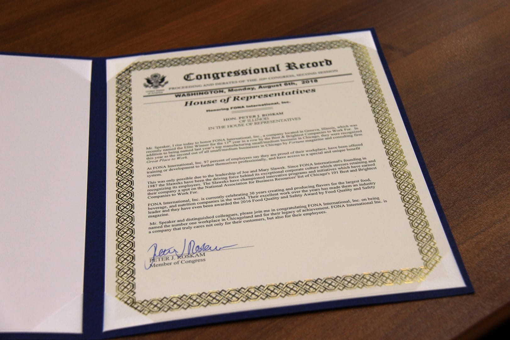 Rep. Roskam entered FONA into the Congressional record in honor of its recent awards, including a ranking as #2 workplace in Chicagoland by Fortune magazine and being named a Small Giant by Forbes, among others. FONA has also been named a top workplace for Millennials and women, by Fortune and Great Place to Work.